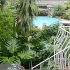 This unit steps out to a small patio overlooking the garden and swimming pool. There is a table and chairs for two so you can enjoy a brisk coffee before departing on your business for the day.